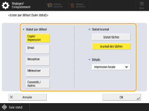 Dans <Statut par défaut> sélectionnez <Copie/Impression>, dans <Statut/Journal> sélectionnez <Journal des tâches> et dans <Détails> sélectionnez <Impression locale>.