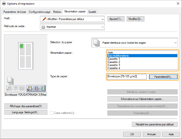 Dans [Alimentation papier], sélectionnez [Bac multifonctions] puis sélectionnez [Enveloppe] dans [Type de papier].