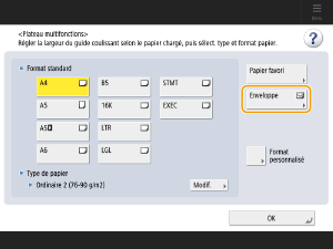 Lorsque vous avez chargé les enveloppes dans le plateau multifonctions, l’écran de réglage de format papier apparaît. Réglez le format papier comme suit.