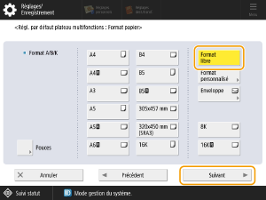 Sur certains modèles, il n'est pas possible de sélectionner <Format libre>. Dans un tel cas, sélectionnez un format de papier existant, tel que <A4> ou <LTR>.