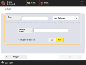 Lorsque vous réglez cette option sur <Oui>, le fichier est divisé de sorte qu’il ne dépasse plus la limite, et il est envoyé en plusieurs envois. Le logiciel d’e-mail du destinataire doit prendre en charge une fonction pour ré-assembler le fichier reçu.