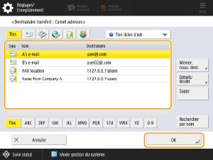 Sélectionnez un destinataire dans <Liste d'adr. perso.>, liste d'adresses du groupe d'utilisateurs, <Liste d'adresses 1> sur <Liste d'adresses 10> ou <Liste d'adresses pour l'administrateur>.