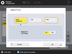En cas d'erreurs d'envoi de fax ou d'annulation de la transmission, un rapport de transmission (TX) de fax n'est pas imprimé. Si <Non> est sélectionné, procédez comme suit pour que le rapport de transmission (TX) ne soit pas imprimé.