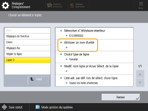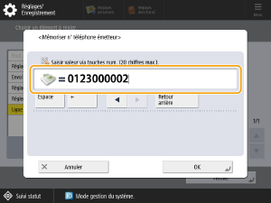 Le numéro de fax de la ligne 1 est enregistré. Ensuite, enregistrez le nom de l'unité.