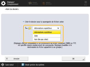 Pour le nom du dossier, vous pouvez sélectionner <Informations expéditeur>, <Date> ou <Non>.