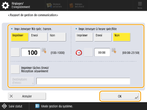 Si <Afficher le journal des tâches> dans <Réglages de gestion> est réglé sur <Non>, vous ne pouvez pas configurer les réglages de rapport de gestion des communications. De plus, si pour <Afficher le journal des tâches> dans <Réglages de gestion>, vous remplacez <Non> par <Oui>, les options <Impr./envoyer Nb spéc. transm.> et <Impr./envoyer à heure spécifiée> pour les rapports de gestion des communications sont automatiquement réglées sur <Non>.
