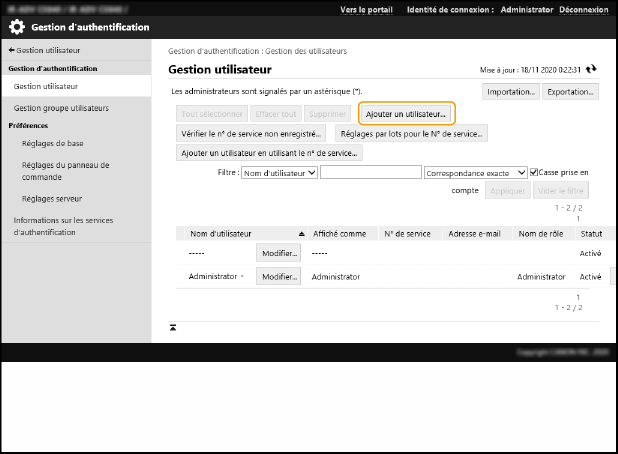 La gestion des utilisateurs sur cet appareil est principalement effectuée à l’aide de l'application d’authentification appelée authentification de l’utilisateur (service de connexion).