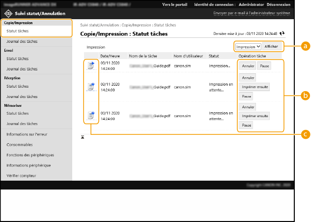 Cette section explique comment utiliser l'interface utilisateur distante pour vérifier le statut des tâches sur cet appareil et annuler ou reprendre des tâches.