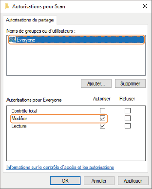 Dans [Noms de groupes ou d’utilisateurs], sélectionnez [Everyone] et cochez la case [Autoriser] dans [Modifier].