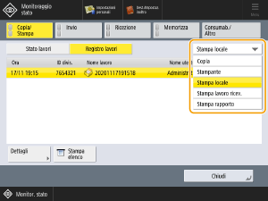 Mostra la cronologia dei lavori di stampa locale, compresi i lavori stampati dalla Mailbox fax e dalla Mailbox RX memoria.