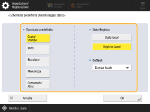 In <Tipo stato predefinito> selezionare <Copia/Stampa>, in <Stato/Registro> selezionare <Registro lavori> e in <Dettagli> selezionare <Stampa locale>.