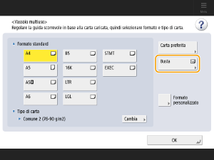 Quando si caricano le buste nel vassoio multiuso, si apre la schermata per l'impostazione del formato carta. Impostare il formato carta come indicato di seguito.