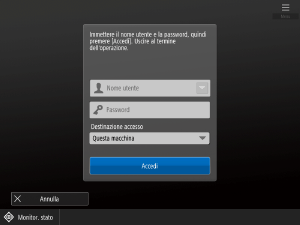 Se viene visualizzata la schermata di accesso, è necessario che un utente autorizzato registrato effettui l’accesso per poter continuare ad usare la macchina. I contenuti visualizzati sulla schermata di accesso variano in base alle impostazioni di gestione utente e gli utenti devono eseguire le operazioni necessarie a seconda dei contenuti visualizzati.