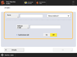 Le opzioni da <Elenco indirizzi 1> a <Elenco indirizzi 10> possono essere paragonate a 10 rubriche. Registrare le destinazioni negli elenchi indirizzi per ciascuna divisione o per ogni business partner aiuta a trovarle più facilmente quando vengono specificate. Questa operazione semplifica anche la gestione degli elenchi indirizzi rinominando semplicemente una divisione o un business partner.