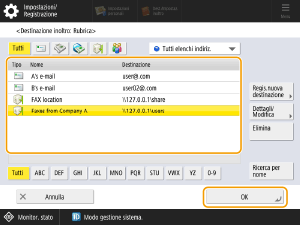 Selezionare una destinazione da <Elenco indir. personale>, l'elenco degli indirizzi dei gruppi di utenti, da <Elenco indirizzi 1> a <Elenco indirizzi 10> oppure <Elenco indirizzi per amministratori>.