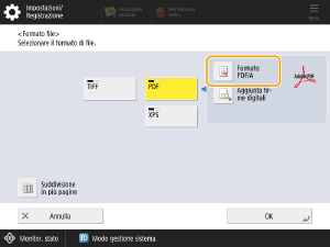 Premere <PDF>, selezionare le opzioni appropriate per l'applicazione file e premere <OK>.