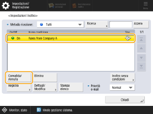 Selezionare “Fax da azienda A”, premere <Convalida/Annulla> e impostare le condizioni inoltro su <On>.