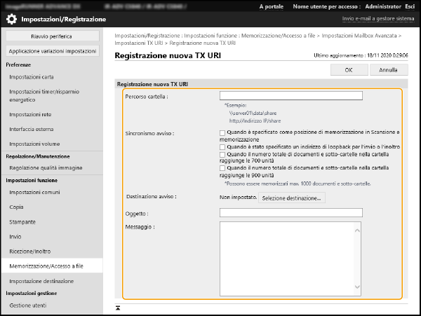 Prima di configurare le impostazioni di inoltro, utilizzare la funzione <Scansione e invio> per controllare che il file arrivi definitivamente alla destinazione registrata.
