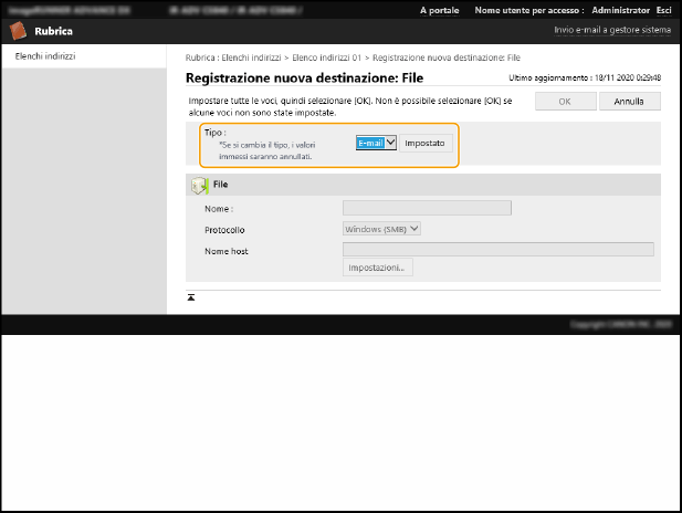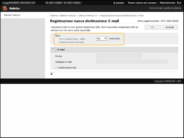 In [Tipo], selezionare [E-mail] e fare clic su [Impostato].