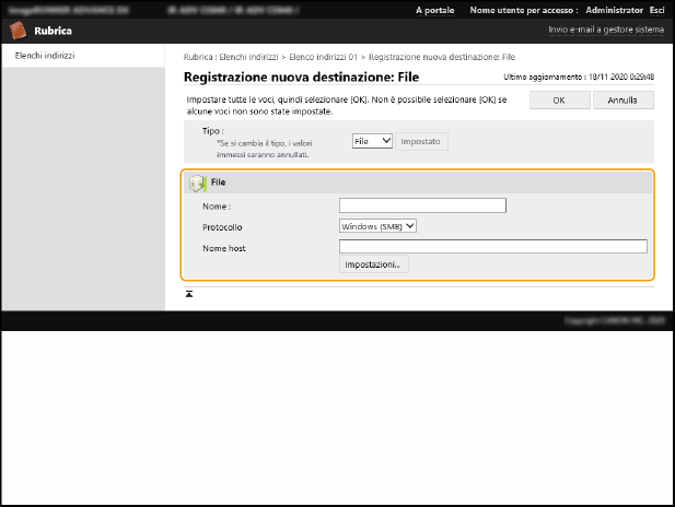 Prima di configurare le impostazioni di inoltro, utilizzare la funzione [Scansione e invio] per verificare che il file arrivi definitivamente alla destinazione registrata.