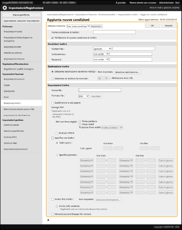 Fare clic su [Aggiunta nuove condizioni] e configurare le impostazioni di inoltro per "Fax da azienda A".