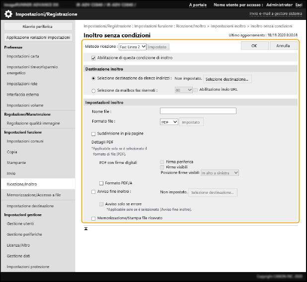 Per inoltrare tutti gli altri documenti fax in arrivo che non soddisfano le condizioni di inoltro, selezionare [Inoltro senza condizioni].