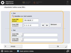Se è presente un server DNS secondario, premere <Server DNS secondario> e immettere l'indirizzo IP. Non è possibile immettere indirizzi che iniziano con "ff" (indirizzi multicast), indirizzi contenenti solo "0" (zero) o indirizzi link-local. Per procedere senza specificare un server DNS secondario, lasciare il campo vuoto.