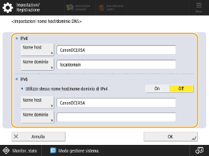 Se il nome host e il nome di dominio sono uguali a quelli impostati per IPv4, premere <On> in <Utilizzo stesso nome host/nome dominio di IPv4>. Per configurare impostazioni diverse, premere <Off>.