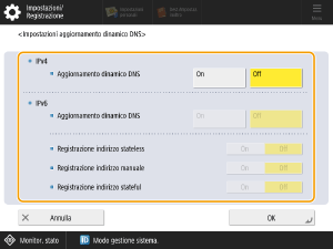 In <Registrazione indirizzo stateless>/<Registrazione indirizzo manuale>/<Registrazione indirizzo stateful>, impostare l'indirizzo da registrare sul server DNS su <On>. Le impostazioni non si aggiornano in automatico se queste voci sono tutte impostate su <Off>.