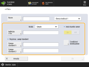 Selezionare <Pieno> se si desidera verificare se un I-Fax viene recapitato alla periferica del destinatario, oppure selezionare <Semplici> se si desidera verificare se un I-Fax viene recapitato a un server di posta. Non è possibile confermare i risultati di invio se la periferica del destinatario non supporta <Modo:>.