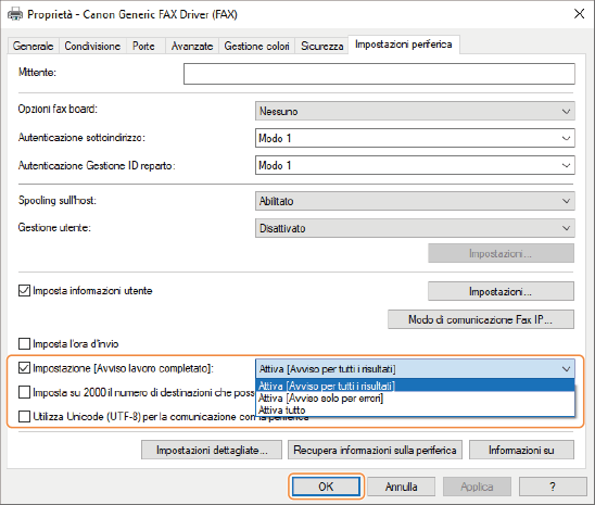 Vengono notificati solo gli errori che si verificano tra la periferica e il fax di destinazione. Anche quando si seleziona [Avviso solo per errori], gli errori che si verificano tra il computer e la periferica non vengono notificati.