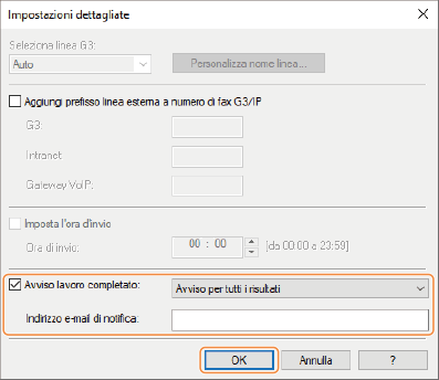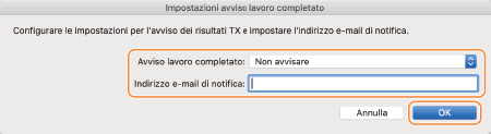 Selezionare [Avviso lavoro completato], immettere un indirizzo e-mail in [Indirizzo e-mail di notifica] e fare clic su [OK].