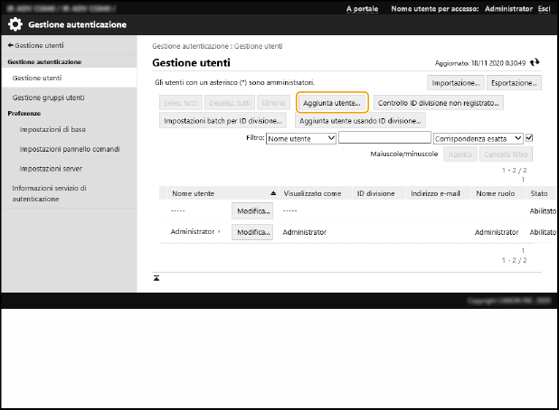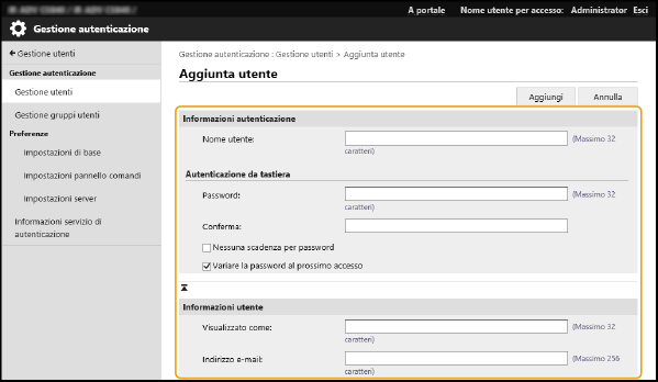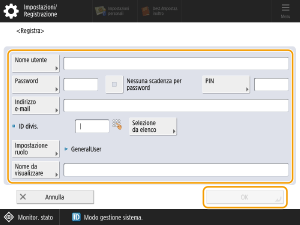 > Gestione > Registrazione delle informazioni utente nel database della macchina per la gestione utenti