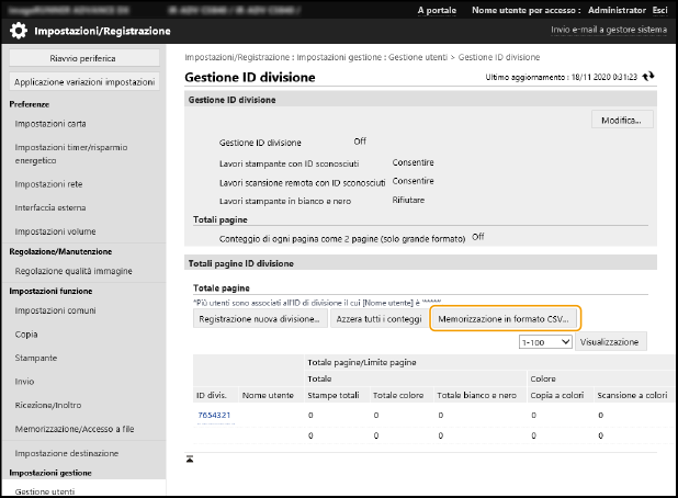 I Totali pagine gestione ID divisione vengono salvati in formato CSV.
