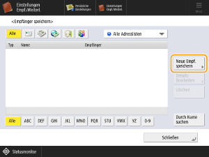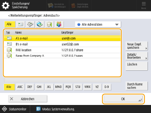Wählen Sie einen Empfänger von <Persönl. Adressliste>, Anwendergruppe-Adressliste, <Adressliste 1> bis <Adressliste 10> oder <Adressliste für Administrator> aus.