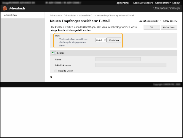 Wählen Sie unter [Typ] die Option [E-Mail], und klicken Sie auf [Einstellen].