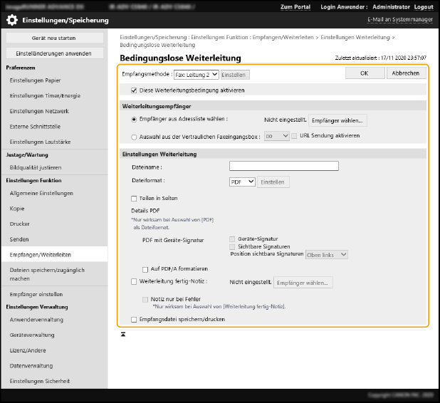 Um alle anderen eingehenden Faxdokumente weiterzuleiten, welche die Weiterleitungsbedingungen nicht erfüllen, wählen Sie [Bedingungslose Weiterleitung].