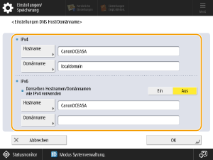 Wenn der Hostname und der Domänenname mit den Einstellungen für IPv4 übereinstimmen, drücken Sie <Ein> unter <Denselben Hostnamen/Domännamen wie IPv4 verwenden>. Um andere Einstellungen zu konfigurieren, drücken Sie <Aus>.