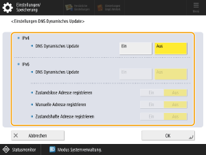 Setzen Sie unter <Zustandslose Adresse registrieren>/<Manuelle Adresse registrieren>/<Zustandshafte Adresse registrieren> die auf dem DNS-Server zu registrierende Adresse auf <Ein>. Beachten Sie, dass die Einstellungen nicht automatisch aktualisiert werden, wenn sie alle auf <Aus> gesetzt sind.