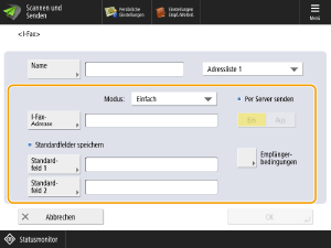 Wählen Sie <Voll>, wenn Sie prüfen möchten, ob ein I-Fax an das Gerät des Empfängers zugestellt wurde, oder wählen Sie <Einfach>, wenn Sie prüfen möchten, ob ein I-Fax an einen Mailserver zugestellt wird. Beachten Sie, dass Sie das Sendeergebnis nicht überprüfen können, wenn <Modus:> von dem Gerät des Empfängers nicht unterstützt wird.