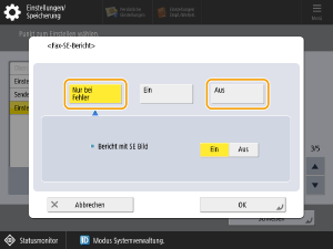 Wenn ein Faxsendefehler auftritt oder die Übertragung abgebrochen wird, druckt das Gerät einen Fax-Sendebericht aus. Wenn <Nur bei Fehler> in dieser Einstellung ausgewählt ist, gehen Sie wie nachstehend beschrieben vor, um keinen Sendebericht zu drucken.