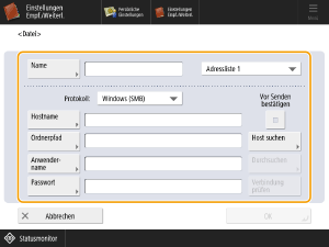 Wenn Sie <Protokoll> auf <Windows (SMB)> einstellen und dann einen nicht vorhandenen Ordner im <Ordnerpfad> angeben, wird ein Ordner automatisch erstellt und die Datei im erstellten Ordner gespeichert. Wenn Sie jedoch über mehrere Ebenen nicht vorhandene Ordner angeben, tritt ein Sendefehler auf.