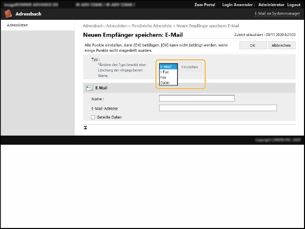 Wählen Sie den Typ des Empfängers unter [Typ], und klicken Sie auf [Einstellen].