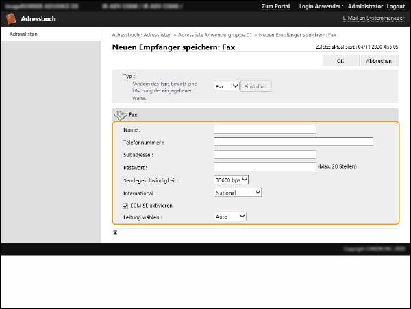Registrieren Sie Standardfelder, wenn Sie einen Internet-Faxdienst verwenden. Wenn Sie solche Dienste nicht nutzen, können Sie diese Einstellung weglassen. Weitere Informationen erhalten Sie von Ihrem Internetdienstanbieter.