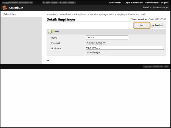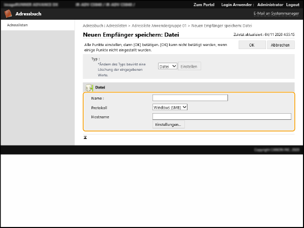 Wählen Sie [Windows (SMB)], [FTP] oder [WebDAV] als Protokoll des Dateiservers. Beim Senden an eine Erweiterter Platz wählen Sie [Windows (SMB)] oder [WebDAV].