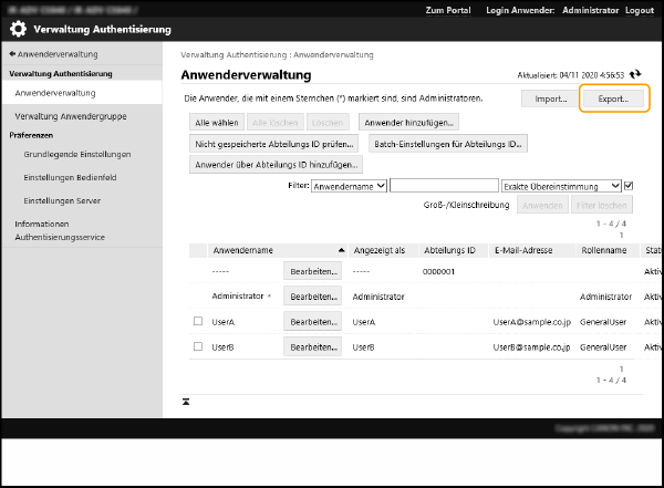 Damit werden Anwenderinformationen in einem erzeugten Dateiformat exportiert, das für die Anwenderauthentisierung verwendet werden kann. Die Dateierweiterung ist ".csv".