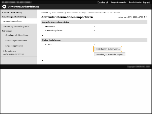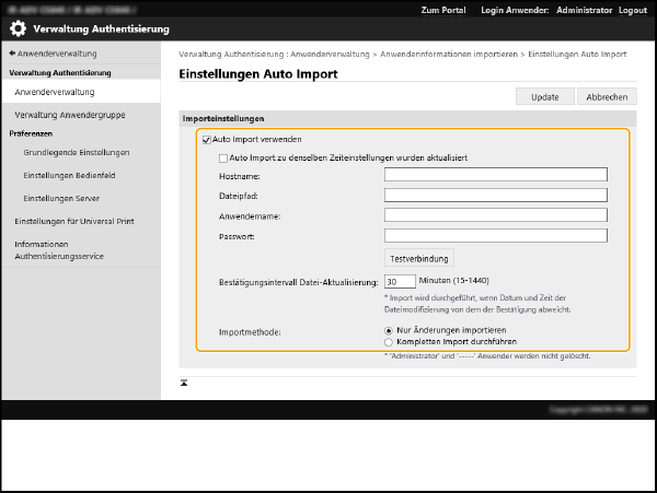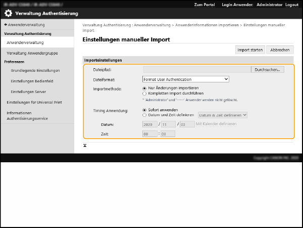 Wenn Sie einen vollständigen Import vornehmen, werden Anwender, die nicht in der Importdatei aufgeführt sind, von diesem Gerät gelöscht. Die zum Zeitpunkt der Geräteauslieferung registrierten Standardanwender "-----" und "Administrator" bleiben jedoch erhalten, auch wenn sie in der Importdatei ausgelassen werden.