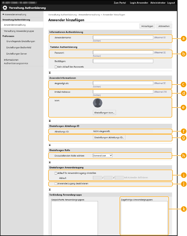 dc | Nein | 0 bis 32 Zeichen | Kontrollzeichen | - (N/A) | Kann nicht geändert werden. Wird den folgenden Benutzern automatisch zugewiesen. Nach Server-Authentifizierung registrierte Benutzer Über <Automatisch speichern, wenn Auftrag empfangen wurde> bei Bild-Login registrierte Benutzer
