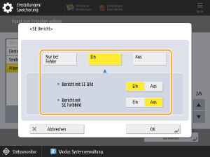 Wählen Sie <Nur bei Fehler> in Schritt 4. Damit wird die Einstellung <Drucken über Optionen zulassen> aktiviert. Setzen Sie <Drucken über Optionen zulassen> auf <Ein>, um festzulegen, ob <SE Bericht> für jeden Auftrag aus <Optionen> gedruckt werden soll.