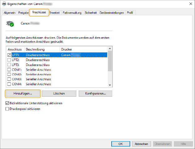 Klicken Sie im Dialogfeld [Druckeranschlüsse] auf [Schließen].